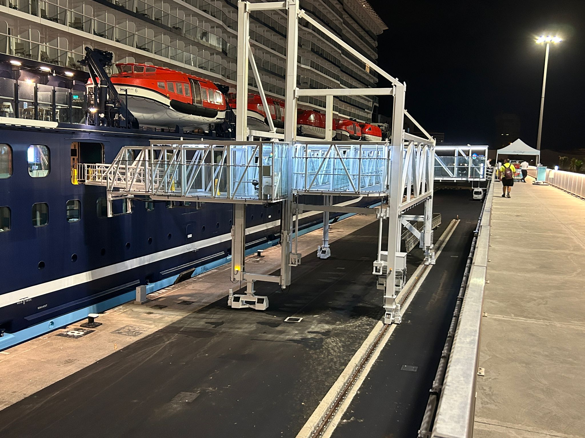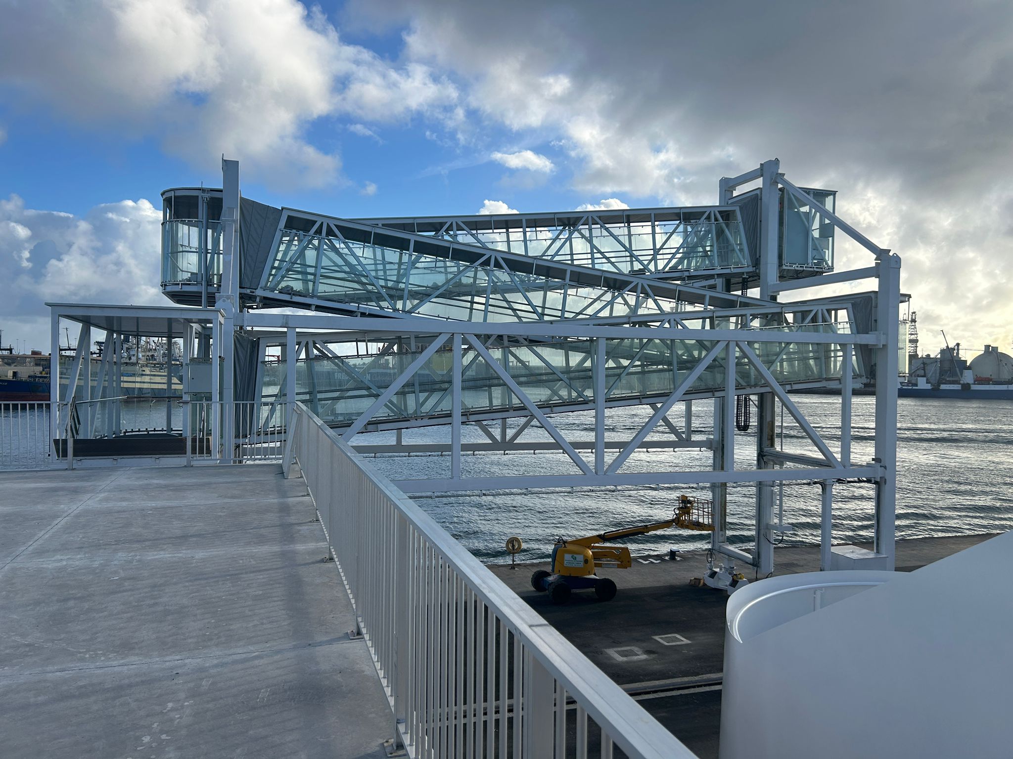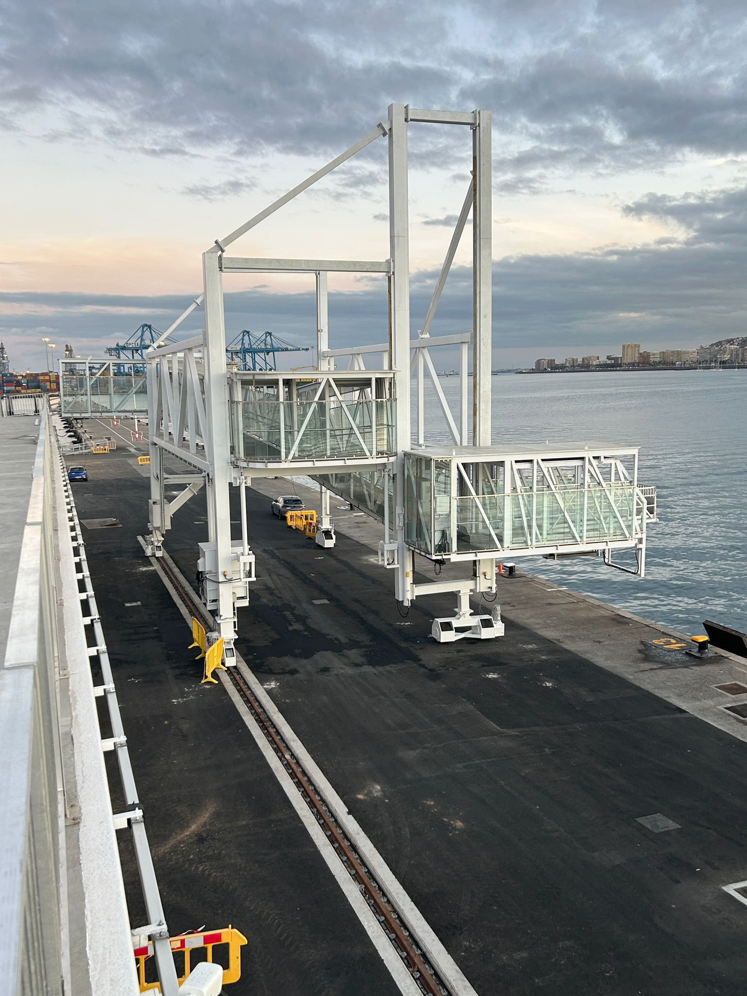 - La tercera pasarela se sitúa en el Muelle Naciente, igualmente configurada con 3 pasillos independientes. Todas las pasarelas son regulables en altura e inclinación para adaptarse a las diferentes puertas de embarque de los cruceros y a las variaciones de marea, garantizando un acceso cómodo, seguro y continuo entre la terminal y el buque, incluso para personas con movilidad reducida.